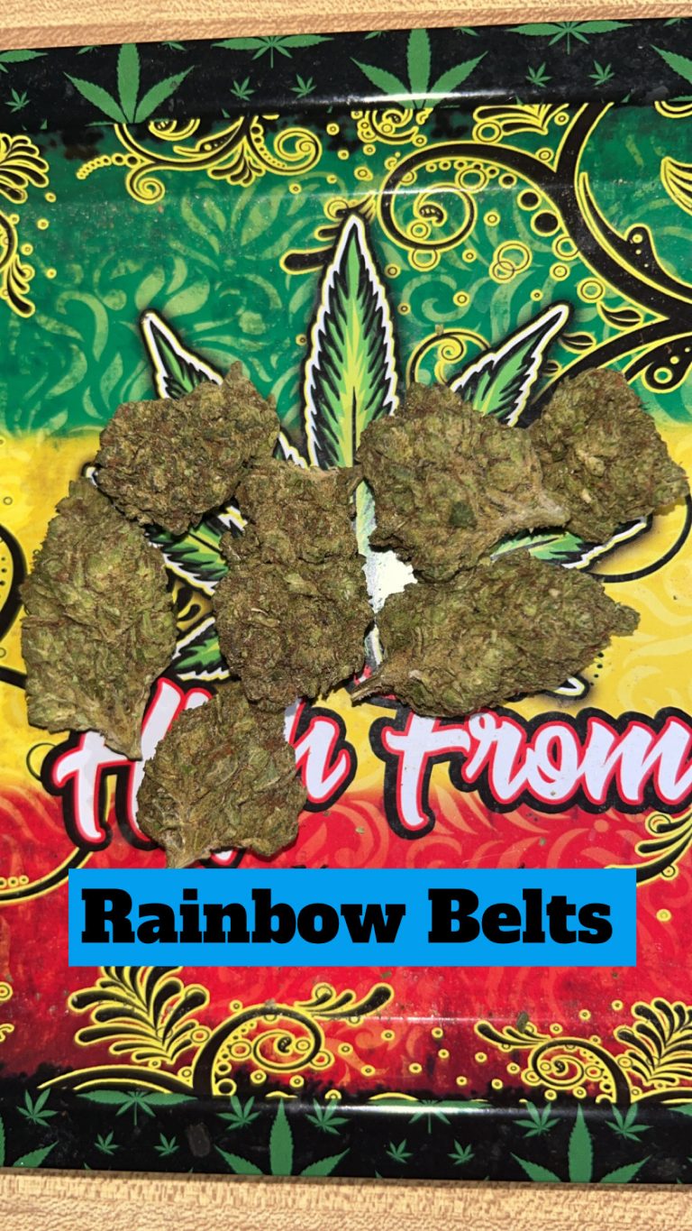 A Rainbow Belts is an indica strain with a 22% THC content made by crossing Moonbow and Zkittles. The effects of Rainbow Belts is mostly calming and offers a blissful high that leaves you feeling happy and relaxed. This highly sedating strain has flavors and aroma that will remind you of sweet and fruity candy and has been known to assist consumers with insomnia.